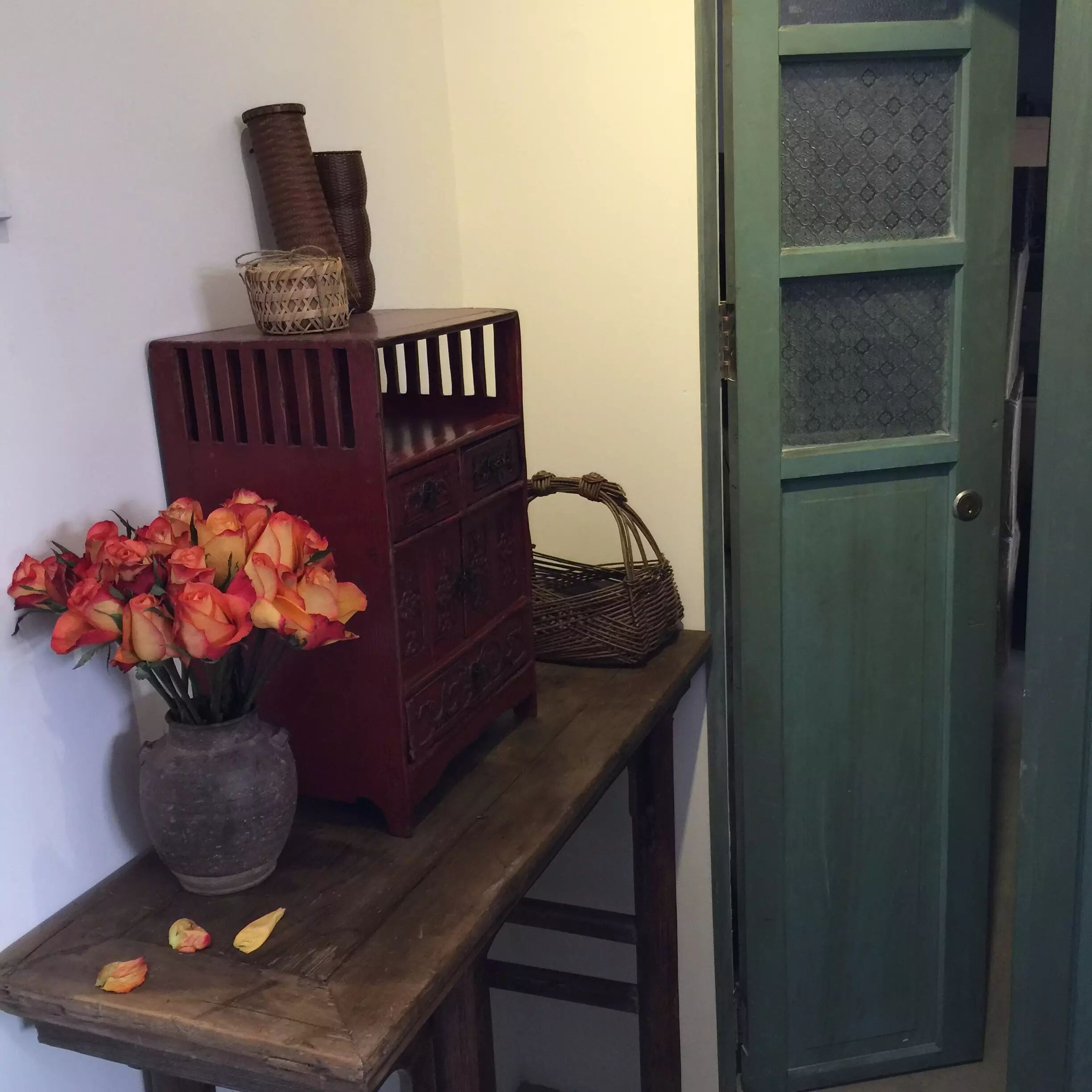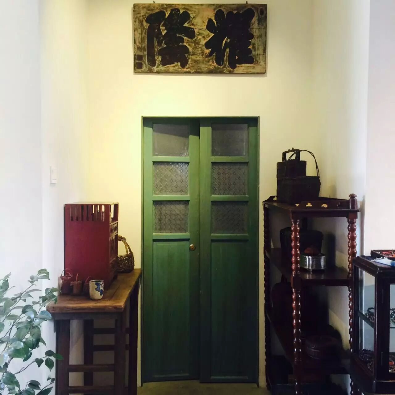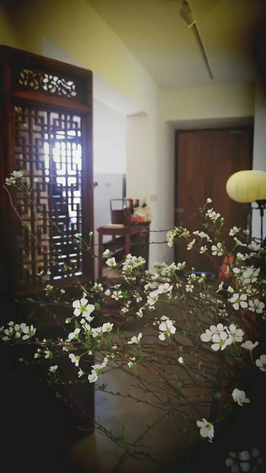 空間因為有著正在展出的古董家具而顯得典雅,而雪柳像是趕著過年一樣的盛開。